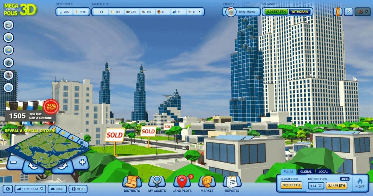 Players acquire Land Plots in Districts to construct buildings using Resources. Some buildings produce Resources, others allow to grab ETH and TRX from in-game “Funds” ($400’000 available at the moment).